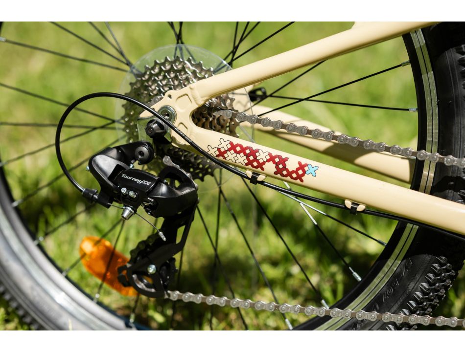 La KROSS Level JR 1.0 está equipada con una transmisión 1×8. Esto permite subir cuestas con eficiencia y rodar rápido en superficies planas. El desviador trasero Shimano, con un diseño duradero y probado, garantiza cambios de marcha suaves.